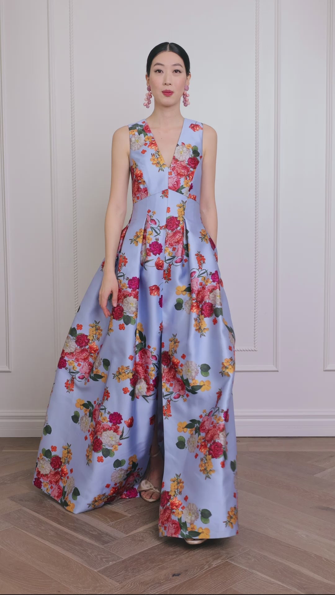 GLACIAL BLUE BRIGHT BOUQUETThe Brooke is our V-neck gown with box pleats, peaked waist seam, and side pockets. This dress is what we consider to be a classic, essential silhouette - a perfect canvas for our most breathtaking prints.