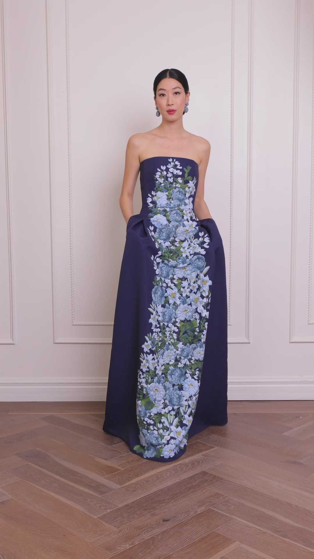 Larisa is a stunning example of organic inspiration and architectural design. The strapless fit and flare gown hugs at the torso and releases at the high hip for the most flattering effect. Featured in a navy faille, a cascade of wildflowers streams down the front of the gown.