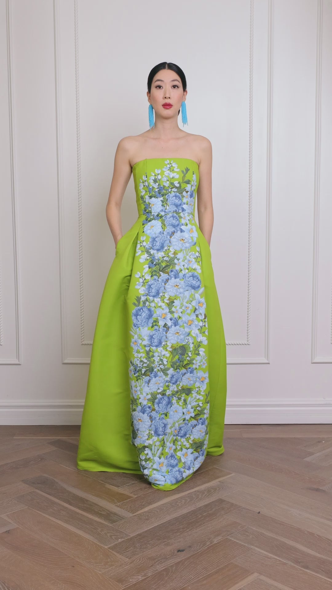 Larisa is a stunning example of organic inspiration and architectural design. The strapless fit and flare gown hugs at the torso and releases at the high hip for the most flattering effect. Featured in a Peridot green faille, a cascade of wildflowers streams down the front of the gown.