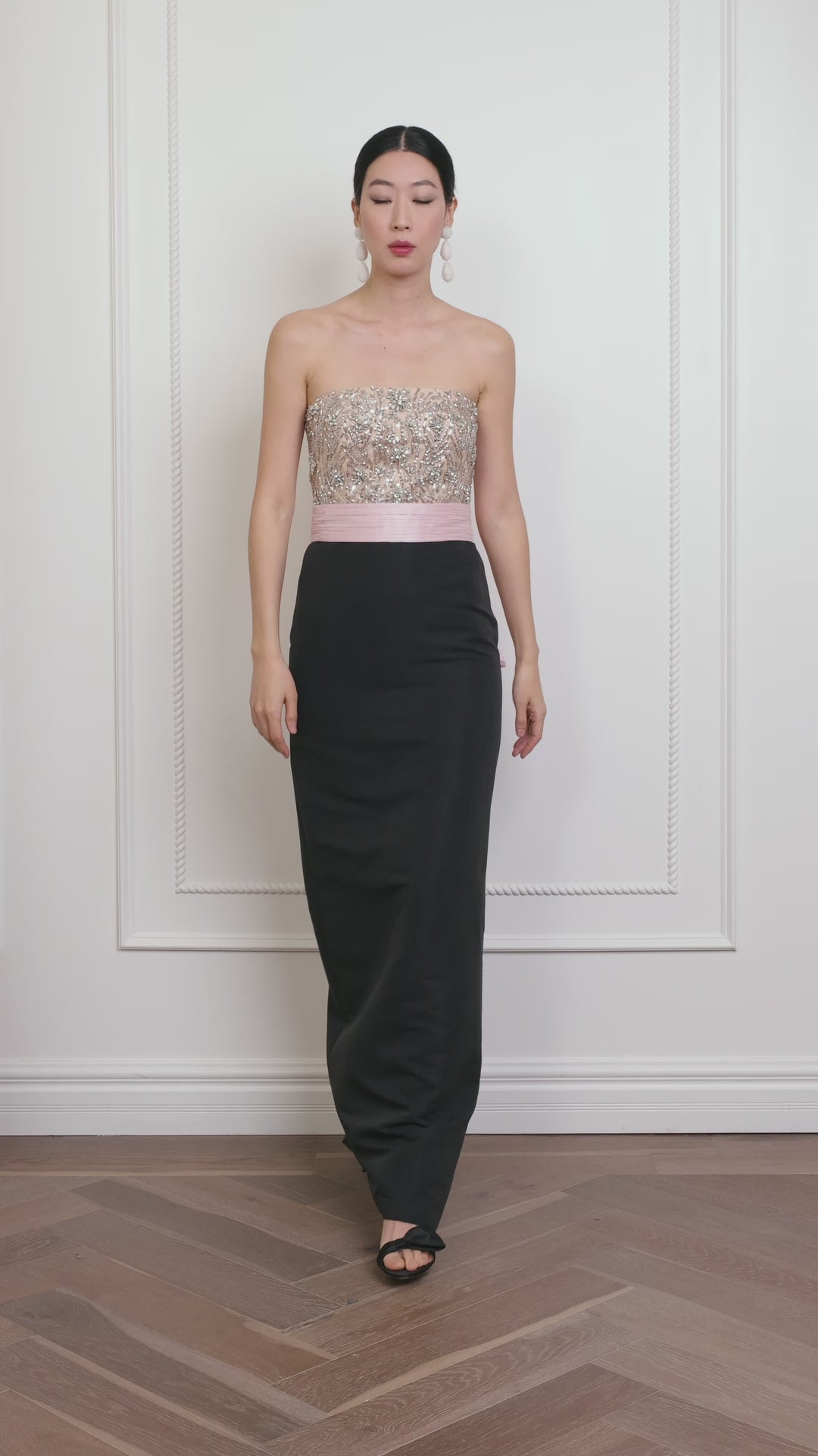 Feminine and flattering, classic and chic, Marilyn is the moment. The strapless gown brings back old-school glamour with its fully encrusted crystal, sequin and bead bodice artfully embroidered by our 3rd generation artisans at our family owned atelier in Mumbai. A black mikado column skirt, and pink cumberbun style belt to tie it all together with a grand gow at back. She is both an entrance and exit kind of dress, stunning from all angles.